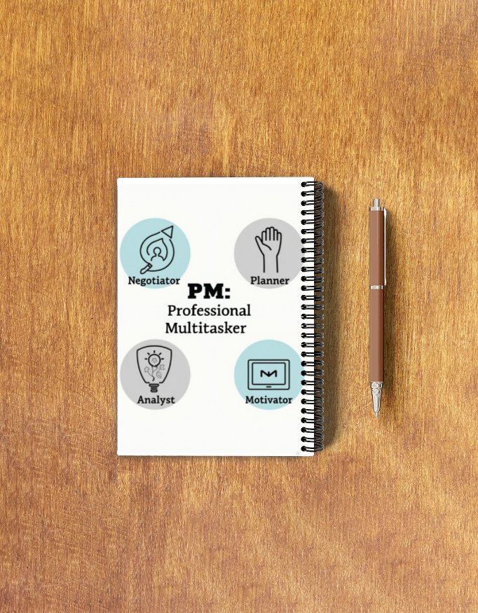 What sets this notepad apart is its unique infographic-style design. Featuring vibrant icons for essential PM roles — negotiator, planner, analyst, and motivator — the cover not only catches the eye but also reflects the core attributes of successful project management. Its clean and modern aesthetic makes it a great fit for both casual desk use and professional settings. The iconic illustrations inspire you to embrace and excel in your daily responsibilities.