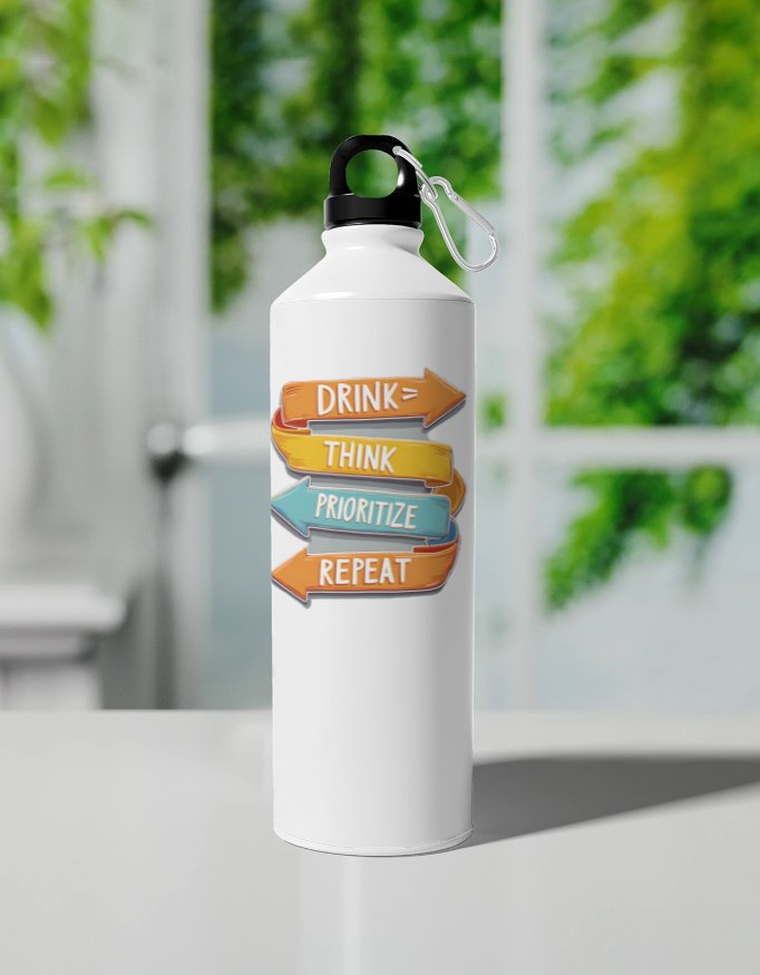 Sipper Bottle – “DRINK > THINK > PRIORITIZE > REPEAT”.