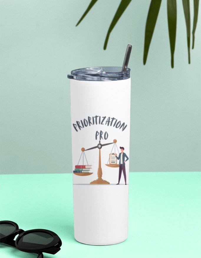 This tumbler isn’t just a beverage container; it’s a statement. Its compact and efficient design fits effortlessly into your lifestyle, whether you’re commuting to work, attending meetings, or heading out for a quick hike. The ‘Prioritization Pro’ message encapsulates the essence of staying focused and organized, resonating with your professional journey.