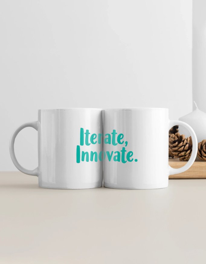 Step forward with the “Iterate, Innovate” White Coffee Mug—because big ideas begin with small steps and bold sips.